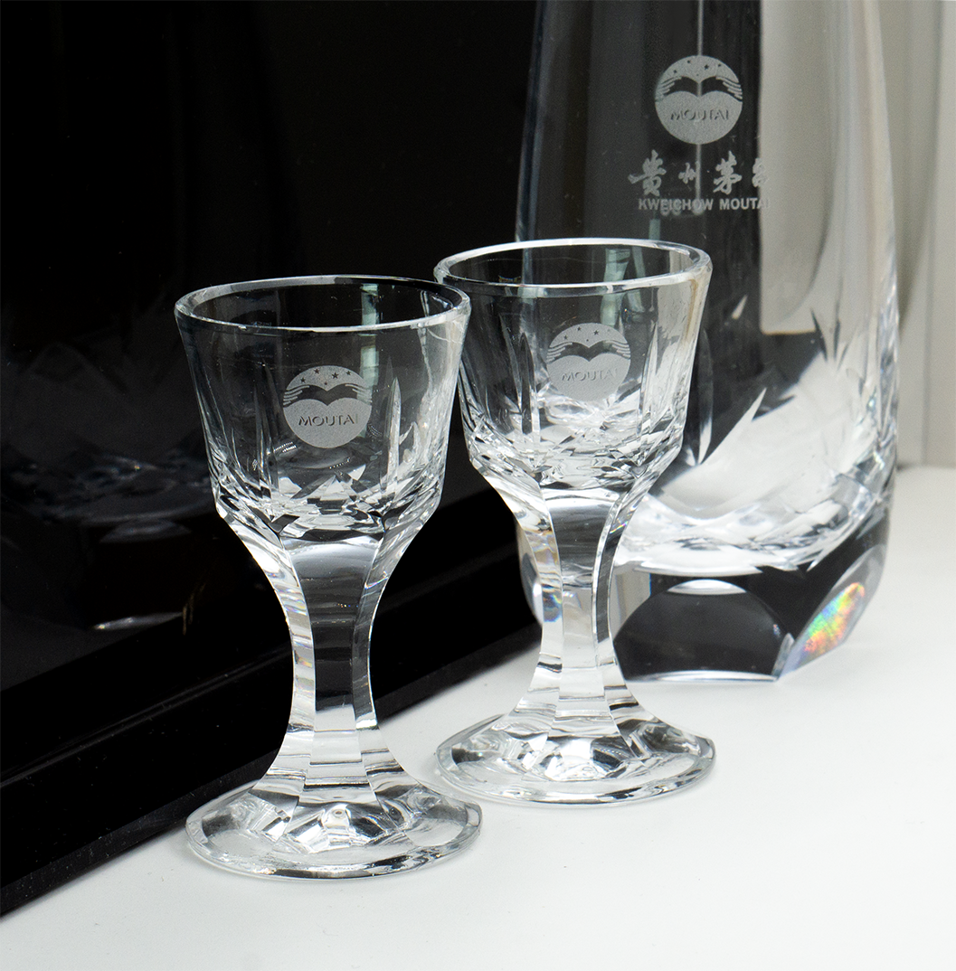 A giftset including two baijiu shot glasses and one decanter, encased in a box with gold accents and silver foil artwork. The glassware are decorated with crystalline details and display the Moutai logo etched onto their surface.